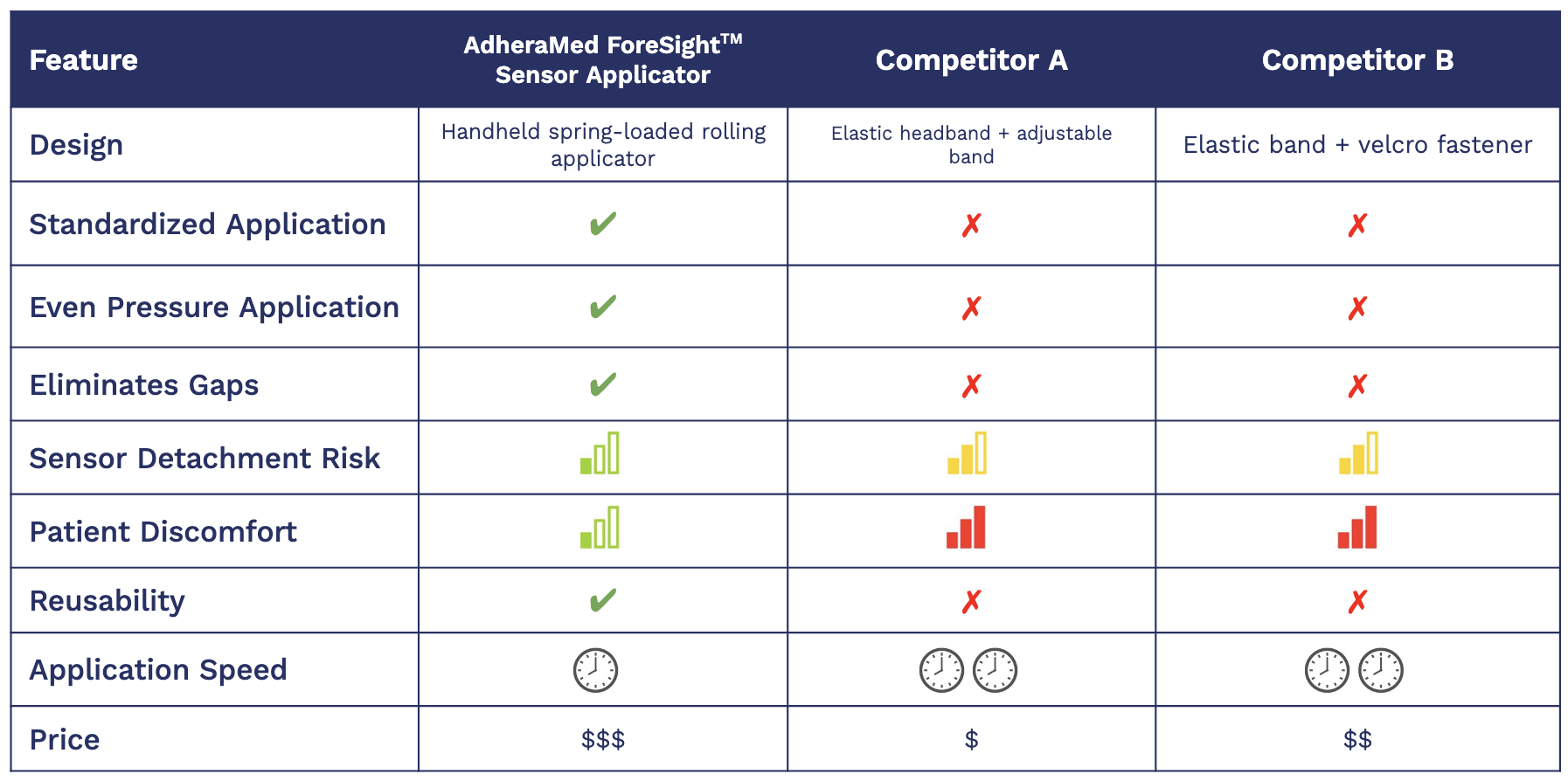 The AdheraMed ForeSightâ„¢ Sensor Applicator holds multiple advantages over its competitors. AdheraMed's spring-loaded rolling applicator ensures standardized, even pressure application every time, eliminating user variability and reducing trapped air bubbles. This design results in lower risk of sensor detachment and minimal patient discomfort, thanks to the absence of bulky materials and excessive tension. The reusability of the AdheraMed applicator makes it cost-effective long-term despite a higher initial price. With faster application time and a durable, consistent performance, the AdheraMed applicator offers a reliable and patient-friendly solution.